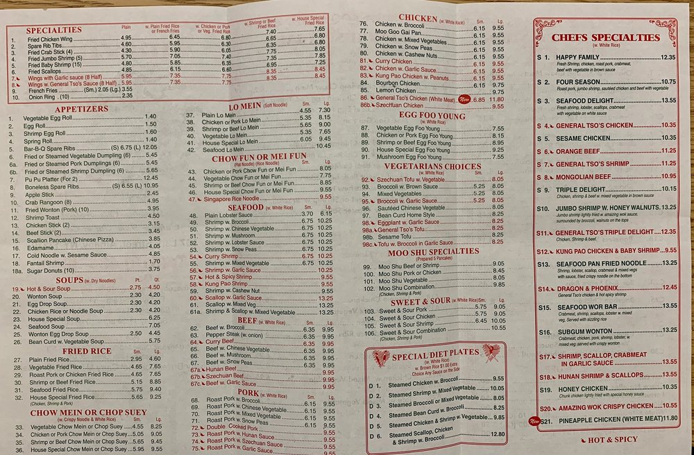 Introducing the menu at Amazing Wok Chinese Restaurant, located on 267 Lark St in Albany, NY. Specializing in Chinese cuisine, this restaurant offers a variety of dishes for dine-in, takeout, and delivery. From their Fried Chicken Wings and Spare Rib Tips to their Fried Crab Stick and Wings with Garlic Sauce, there is something for everyone to enjoy. Their menu also includes appetizers like Vegetable Egg Rolls and BBQ Spare Ribs, as well as soups like Hot and Sour Soup and Egg Drop Soup. Customers rave about the flavorful dishes, with reviews highlighting the fresh ingredients and generous portions. Whether you're a fan of classic Chinese dishes or looking to try something new, Amazing Wok Chinese Restaurant is a must-visit spot in the Albany area.